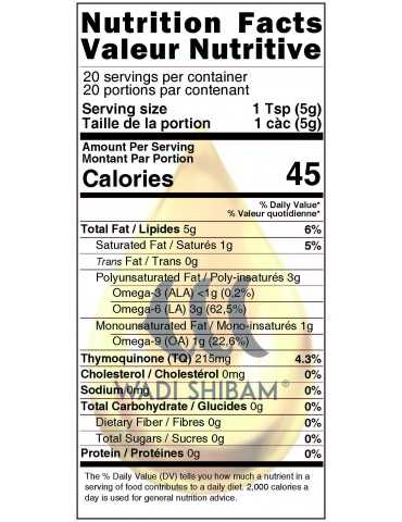 A product signed Wadi Shibam® from a First Cold Pressed and not filtered, based only on "Habba Sawda" Ethiopian Black Seeds Nigella Sativa "Habachia" certified 99,9% pure.
